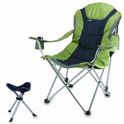This Picnic Time Reclining Camp Chair /Footrest ensemble is no ordinary camp lounger. The chair features a folding steel frame that can hold up to 300 pounds, a padded seat and back rest covered in durable 600D polyester canvas. Three seating positions add to this chair's functionality, along with the adjustable armrests, an insulated drink holder in the right armrest, a large zippered pocket on back of chair, and a matching storage tote with carrying strap. The reclining camp chair is great at sporting events or for outdoor activity such as lounging by the lake or beach, camping and fishing. The coordinating footrest that comes with this chair has a lightweight, tripod style and features a durable steel frame with rubber-tipped non-skid feet, sturdy polyester fabric, and a 14-inch measurement from corner to corner.